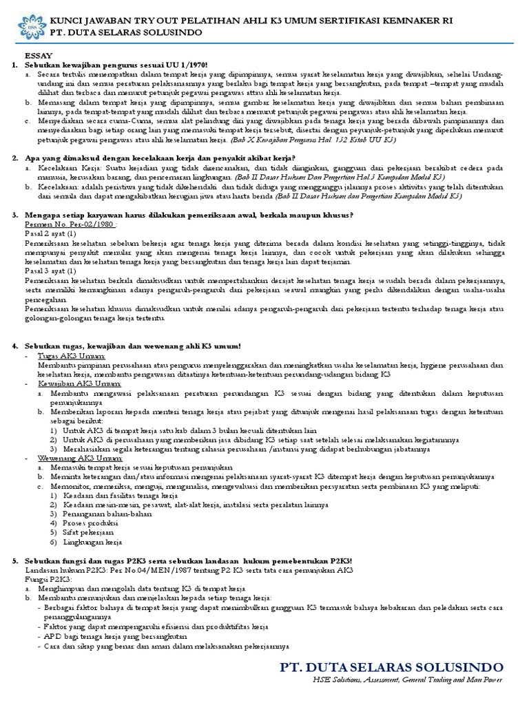 Contoh soal jawaban ahli k3 umum Ada perusahaan yang bergerak di bidang manufaktur dan menggunakan bahan kimia sebagai bahan baku diantara nya sodium selenide dengan kuantitas 100kghari dan sodium picramate dengan kuantitas 100tonhari. Bahwa setiap tenaga kerja berhak mendapat perlindungan dalam pekerjaannya untuk meningkatkan kesejahteraannya dan produktivitasnya secara nasional b. Ujian calon ahli k3 umum soal dan jawaban ujian koprehensif 1.